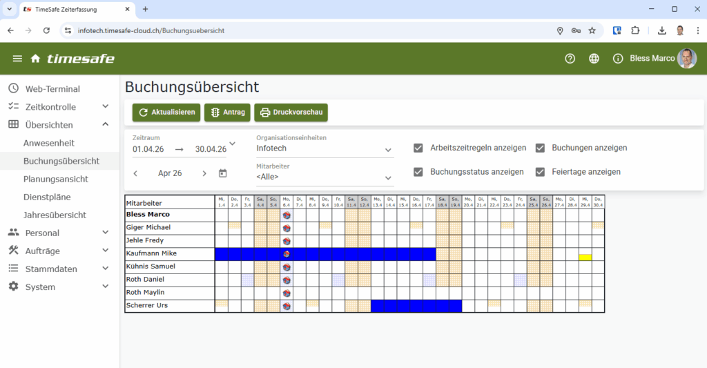 In den Stammdaten können Sie für jede Buchungsart eine Farbe vorgeben. Diese Farben werden auch in der Buchungsübersicht angezeigt. So kann die Buchungsübersicht z.B. einfach für die Ferienplanung verwendet werden. Ihre Mitarbeiter erfassen die Ferien via Antragswesen. Der oder die Vorgesetzte genehmigt die Anträge – schon sind die Ferien in der Buchungsübersicht zu sehen.
