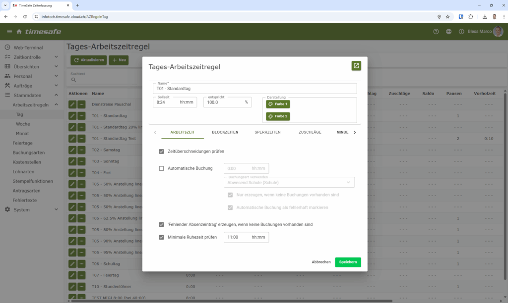 Die Tages-Arbeitszeitregeln erlauben eine flexible Definition der betrieblichen Arbeitszeitregeln. Bestimmen Sie Blockzeiten oder Sperrzeiten und legen Sie fest, welche Pausenregelung angewendet werden soll. Legen Sie eine Wochen-Höchstarbeitszeit oder Monats-Gleitzeitlimiten fest. Auf Basis der Arbeitszeitregeln werden die Arbeitszeitmodelle für die Mitarbeiter definiert.