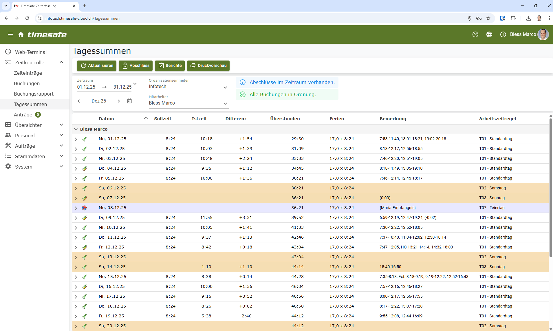 Die Präsenzzeiten pro Tag werden übersichtlich dargestellt und die Buchungen stehen für eine manuelle Bearbeitung zur Verfügung. Die vom Mitarbeiter erfassten Kommen- und Gehen-Einträge bleiben erhalten. Die Zugriffsrechte lassen sich individuell steuern.
